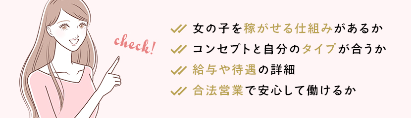 ホームページや在籍女性の写真をチェックするだけでも、どんなタイプのお店なのか把握できます。自分の魅力を最大限に生かせるコンセプトのお店を選ぶことで、より効率的に収入を得られるでしょう。