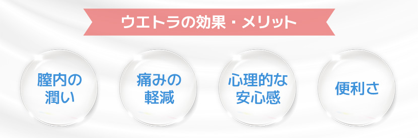 膣の乾燥や摩擦は、性交時の痛みやヒリつきの原因となります。ウエトラは潤滑力が高く、挿入時の摩擦を減らして痛みを和らげる効果が期待できます。特に更年期や産後など、デリケートな時期の乾燥にも対応できる点が強みです。